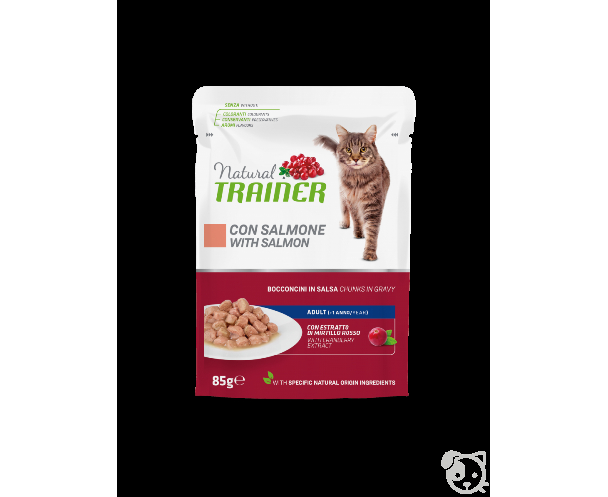 NATURAL TRAINER CAT SALMON 85G - täisväärtuslik toit täiskasvanud kassidele, konservid tükkideks želees koos lõhe, kana liha ja jõhvika lehe ekstraktiga.