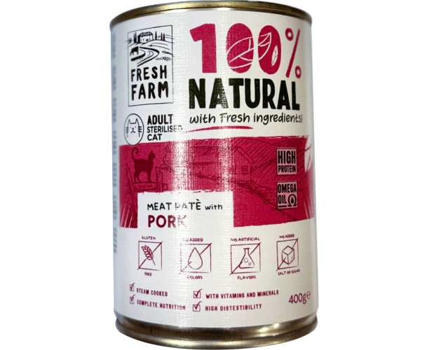 Prefera Fresh Farm CAT Smooth patee seapõhkel 400 gr - täisväärtuslik toit kassidele, pasteedi kujul konserveeritud kassidele, sealiha.